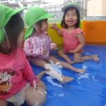 乳児園庭にて水遊び 冷たい水が気持ちいい。 子ども達は、水遊びが大好きです。 幼児クラス プール遊び ワニ歩きやバタ足をしています。 冷たい水に子ども達は大喜びです。 水に顔をつけられます。