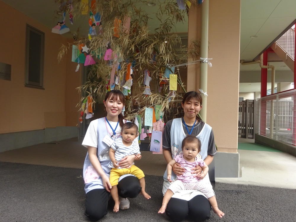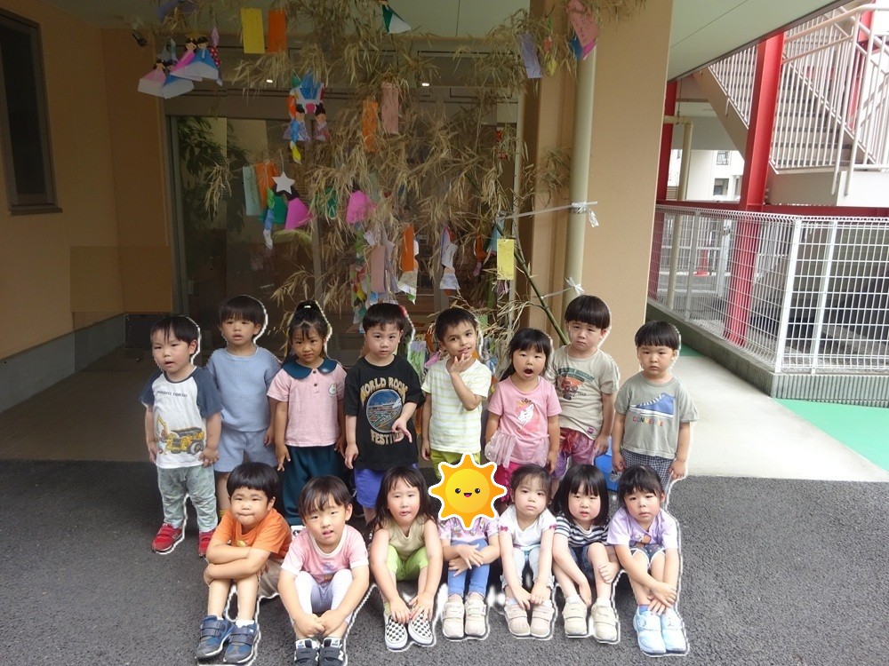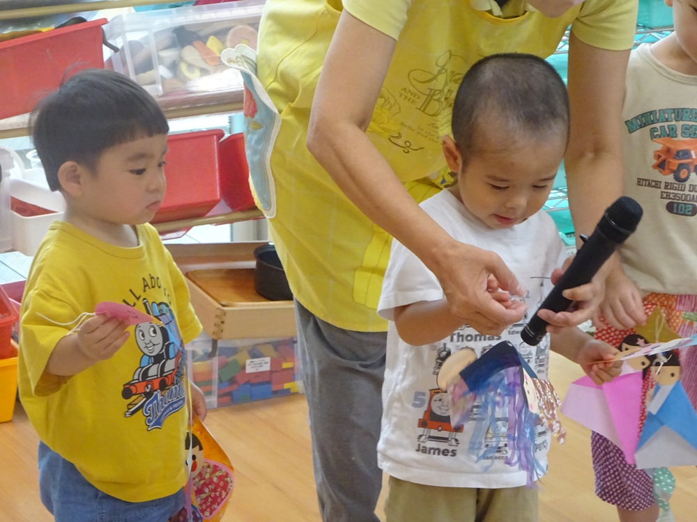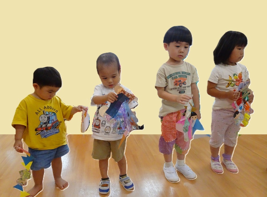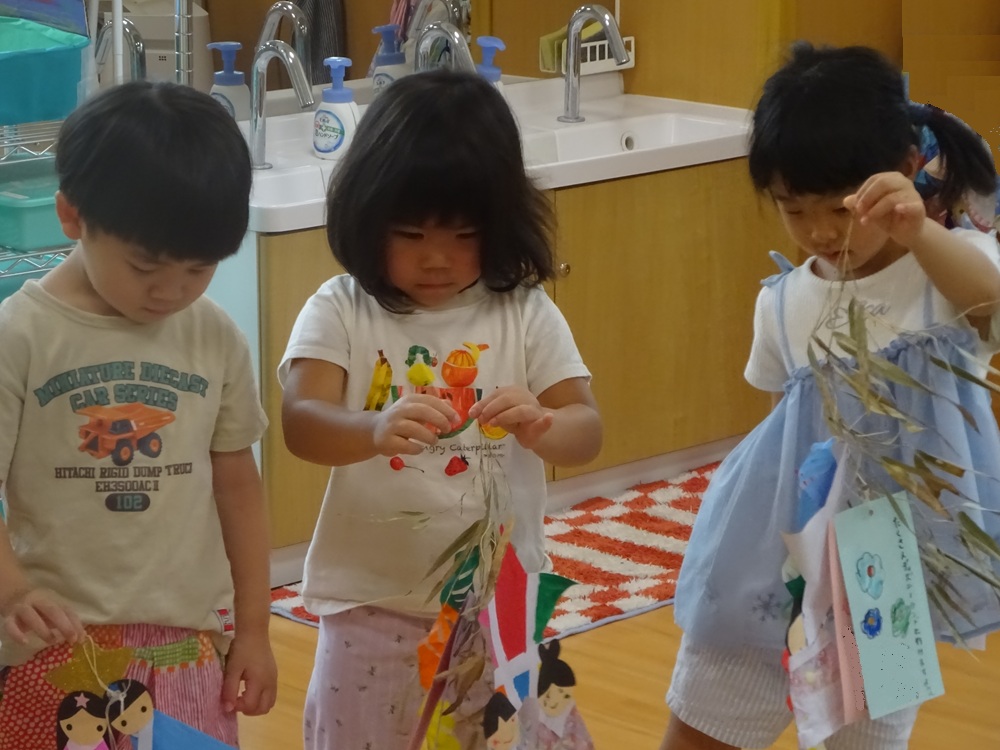 短冊に願いごとを書いて、親子で笹の葉に飾ります。